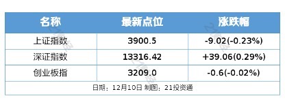 12月10日,市场探底回升,三大指数涨跌不一,深成指、创业板指盘中先后翻红,创业板指此前一度跌超2%。截至收盘,沪指跌0.23%,深成指涨0.29%,创业板指跌0.02%。沪深两市成交额1.78万亿,较上一个交易日缩量1254亿。